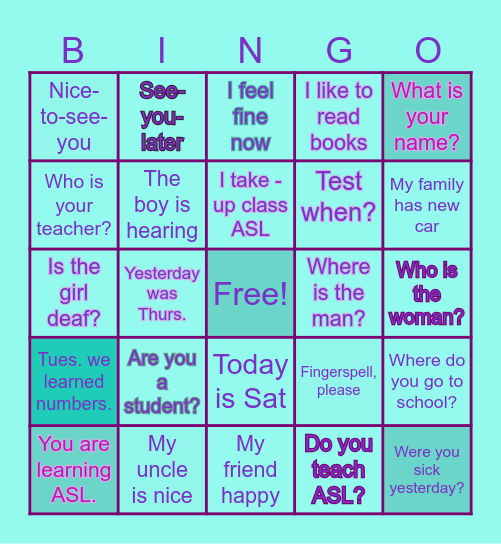 This bingo card has a free space and 24 words: You are learning ASL., Are you a student?, I take -up class ASL, Do you teach ASL?, What is your name?, Nice-to-see-you, See-you-later, I feel fine now, Where is the man?, Who is the woman?, Is the girl deaf?, The boy is hearing, Fingerspell, please, Where do you go to school?, Who is your teacher?, My uncle is nice, My friend happy, I like to read books, My family has new car, Tues. we learned numbers., Yesterday was Thurs., Today is Sat, Test when? and Were you sick yesterday?.