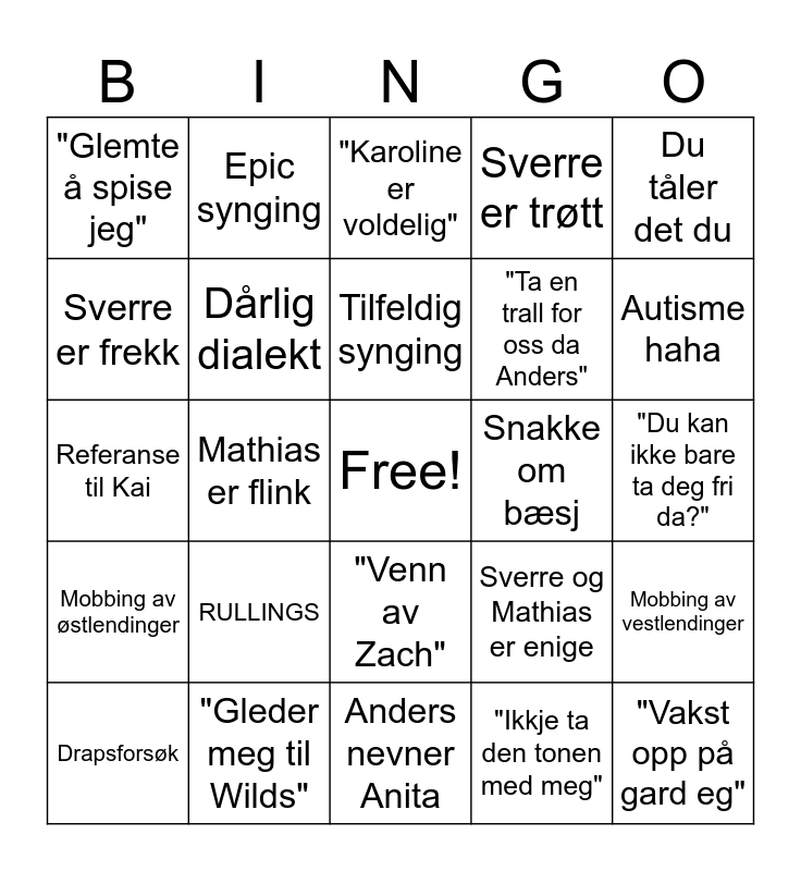 This bingo card has a free space and 24 words: RULLINGS, "Gleder meg til Wilds", Tilfeldig synging, Drapsforsøk, Du tåler det du, "Glemte å spise jeg", Sverre er frekk, Epic synging, Snakke om bæsj, "Venn av Zach", "Ta en trall for oss da Anders", Referanse til Kai, Sverre og Mathias er enige, Mobbing av vestlendinger, Dårlig dialekt, "Ikkje ta den tonen med meg", "Du kan ikke bare ta deg fri da?", "Karoline er voldelig", Autisme haha, Mathias er flink, "Vakst opp på gard eg", Mobbing av østlendinger, Sverre er trøtt and Anders nevner Anita.
