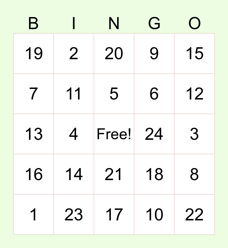 This bingo card has a free space and 24 words: 1, 14, 5, 10, 15, 19, 2, 20, 24, 3, 13, 11, 18, 8, 7, 23, 17, 9, 12, 16, 4, 21, 6 and 22.