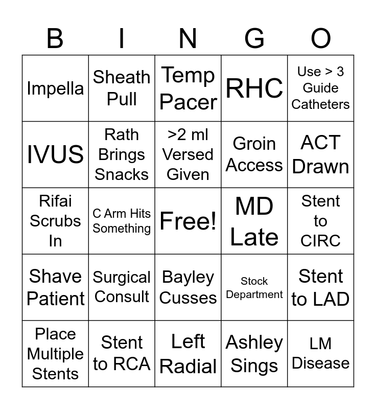 This bingo card has a free space and 36 words: STEMI, FEMI, Not Called In, Rath Brings Snacks, Stock Department, Shave Patient, >2 ml Versed Given, Only gave 1 and 25, Use > 3 Guide Catheters, Radial goes to Groin, C Arm Hits Something, RHC, LHC, MD Late, ACT Drawn, Impella, Waiting on Labs, Surgical Consult, LM Disease, Temp Pacer, Stent to CIRC, Stent to LAD, Stent to RCA, Place Multiple Stents, Left Radial, Sheath Pull, Rifai Scrubs In, DFR/FFR, Groin Access, IVUS, Floor Gives Anticoag, Called In, Ashley Sings, Bayley Cusses, Perform Lumason and Empty Trophon.