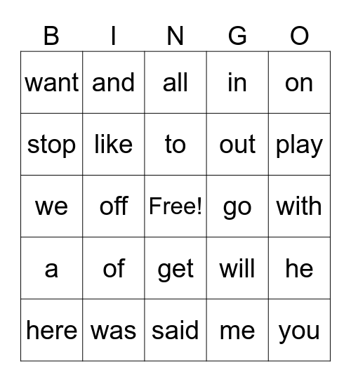 This bingo card has a free space and 34 words: the, me, is, I, a, like, on, here, and, look, to, all, my, see, go, play, was, we, of, will, get, no, want, with, said, you, in, put, out, stop, from, off, he and has.