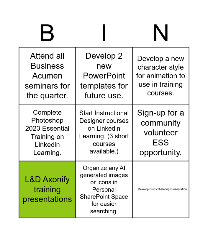 This bingo card has 1 images and 8 words: L&D Axonify training presentations, Start Instructional Designer courses on Linkedin Learning. (3 short courses available.), Develop a new character style for animation to use in training courses., Attend all Business Acumen seminars for the quarter., Develop 2 new PowerPoint templates for future use., Sign-up for a community volunteer ESS opportunity., Complete Photoshop 2023 Essential Training on Linkedin Learning. and Organize any AI generated images or icons in Personal SharePoint Space for easier searching..