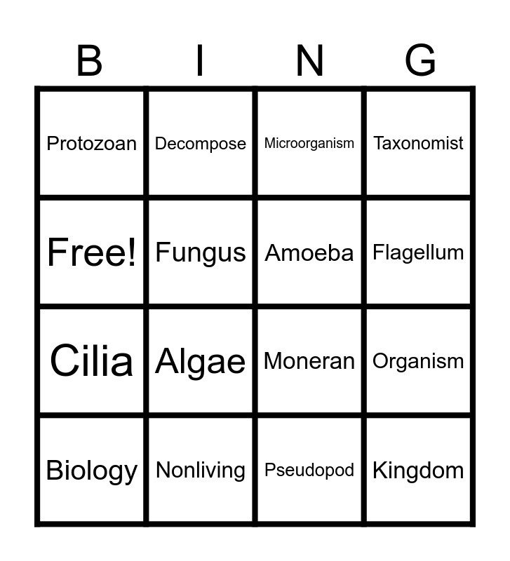 This bingo card has 16 words: Nonliving, Organism, Microorganism, Protozoan, Cilia, Decompose, Moneran, Pseudopod, Free!, Fungus, Biology, Taxonomist, Algae, Flagellum, Amoeba and Kingdom.