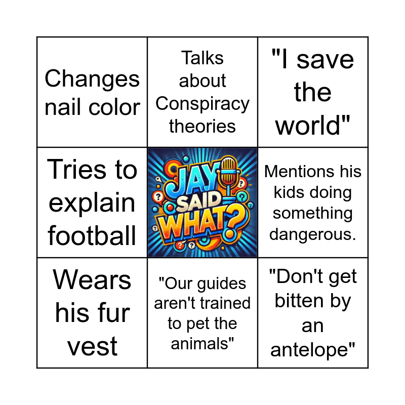 This bingo card has a free space and 8 words: Mentions his kids doing something dangerous., "I save the world", Talks about Conspiracy theories, Wears his fur vest, Changes nail color, "Don't get bitten by an antelope", Tries to explain football and "Our guides aren't trained to pet the animals".