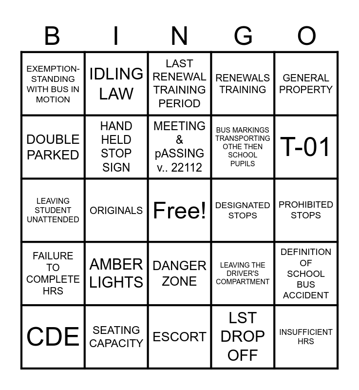This bingo card has a free space and 26 words: DANGER ZONE, LST DROP OFF, MEETING & pASSING v.. 22112, SEATING CAPACITY, GENERAL PROPERTY, EXEMPTION-STANDING WITH BUS IN MOTION, DOUBLE PARKED, IDLING LAW, PROHIBITED STOPS, LEAVING THE DRIVER'S COMPARTMENT, BUS MARKINGS TRANSPORTING OTHE THEN SCHOOL PUPILS, LEAVING STUDENT UNATTENDED, DEFINITION OF SCHOOL BUS ACCIDENT, CDE, ORIGINALS, TRAINING STAFF, RENEWALS TRAINING, FAILURE TO COMPLETE HRS, LAST RENEWAL TRAINING PERIOD, INSUFFICIENT HRS, T-01, ESCORT, DESIGNATED STOPS, AMBER LIGHTS, HAND HELD STOP SIGN and ACTIVITY TRIPS.