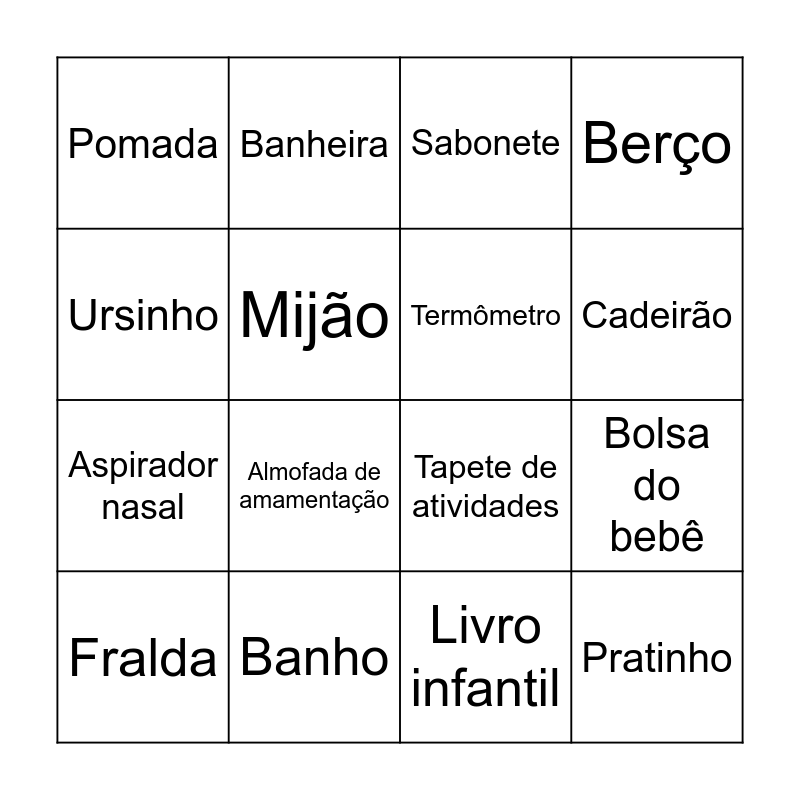 This bingo card has 51 words: Free!, Fralda, Mamadeira, Chupeta, Carrinho, Bebê, Banheira, Roupinha, Mijão, Babador, Termômetro, Berço, Naninha, Brinquedo, Lencinho, Chocalho, Cadeirão, Banho, Mordedor, Ursinho, Bolsa do bebê, Toalha, Pomada, Aspirador nasal, Amamentação, Travesseiro, Almofada de amamentação, Meia, Pantufa, Sabonete, Shampoo, Body, Sapatinho, Cadeira de carro, Lençol, Pente e escova, Babá eletrônica, Protetor de berço, Bico de silicone, Creme para assaduras, Livro infantil, Pratinho, Colherzinha, Talco, Termômetro de banho, Mobile, Tapete de atividades, Kit higiene, Babador de silicone, Fronha and Luvas de bebê.