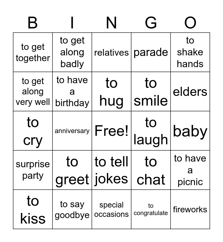 This bingo card has a free space and 24 words: to greet, to say goodbye, to hug, to kiss, to shake hands, to get together, to get along very well, to get along badly, to laugh, to tell jokes, to smile, to cry, to chat, to have a picnic, to have a birthday, to congratulate, baby, relatives, elders, anniversary, fireworks, surprise party, parade and special occasions.