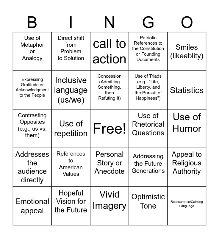 This bingo card has a free space and 29 words: Emotional appeal, Establishes credibility, Use of repetition, Appeal to Patriotism, Use of Metaphor or Analogy, call to action, Inclusive language (us/we), References to American Values, Use of Rhetorical Questions, Hopeful Vision for the Future, Use of Humor, Reassurance/Calming Language, Vivid Imagery, Optimistic Tone, Statistics, "Name dropping", Personal Story or Anecdote, Addresses the audience directly, Smiles (likeablity), Contrasting Opposites (e.g., us vs. them), Addressing the Future Generations, Use of a Famous Quote, Use of Triads (e.g., "Life, Liberty, and the Pursuit of Happiness"), Expressing Gratitude or Acknowledgment to the People, Patriotic References to the Constitution or Founding Documents, Direct shift from Problem to Solution, Appeal to Religious Authority, Concession (Admitting Something, then Refuting It) and Use of Symbolism (e.g., the flag, the eagle).