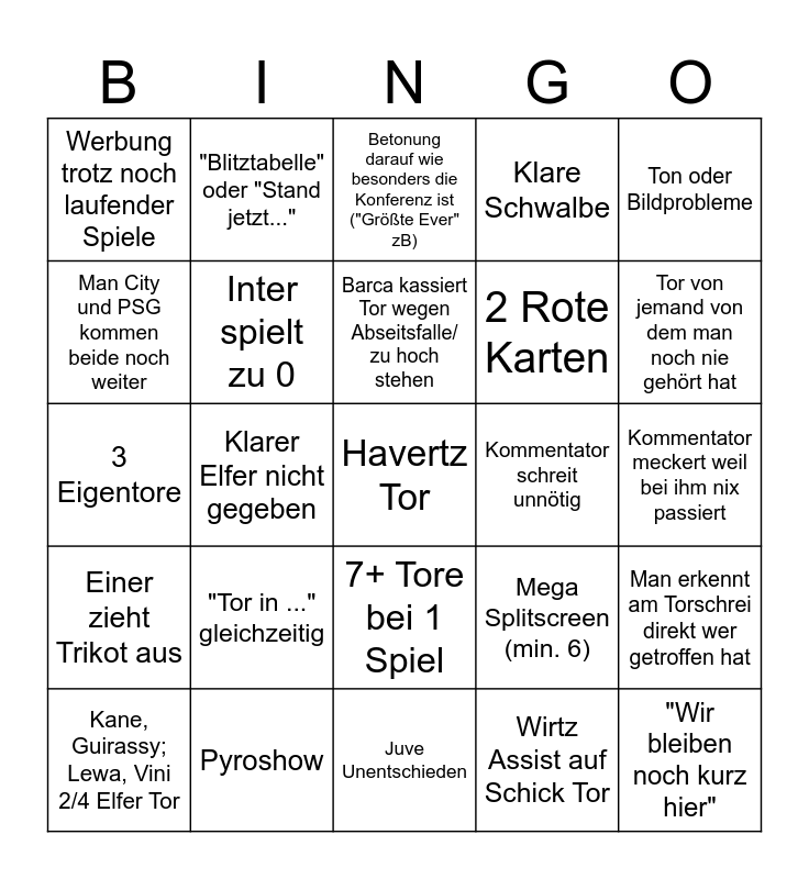 This bingo card has 25 words: "Tor in ..." gleichzeitig, Juve Unentschieden, Barca kassiert Tor wegen Abseitsfalle/ zu hoch stehen, Kane, Guirassy; Lewa, Vini 2/4 Elfer Tor, Ton oder Bildprobleme, Werbung trotz noch laufender Spiele, Man City und PSG kommen beide noch weiter, "Blitztabelle" oder "Stand jetzt...", Kommentator schreit unnötig, 7+ Tore bei 1 Spiel, 2 Rote Karten, 3 Eigentore, Mega Splitscreen (min. 6), Man erkennt am Torschrei direkt wer getroffen hat, Inter spielt zu 0, "Wir bleiben noch kurz hier", Kommentator meckert weil bei ihm nix passiert, Betonung darauf wie besonders die Konferenz ist ("Größte Ever" zB), Tor von jemand von dem man noch nie gehört hat, Klarer Elfer nicht gegeben, Havertz Tor, Pyroshow, Einer zieht Trikot aus, Klare Schwalbe and Wirtz Assist auf Schick Tor.