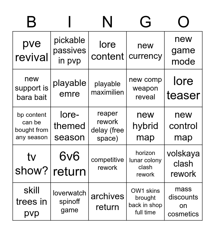 This bingo card has a free space and 24 words: skill trees in pvp, 6v6 return, playable maximilien, OW1 skins brought back in shop full time, new game mode, pve revival, pickable passives in pvp, lore content, new hybrid map, new control map, bp content can be bought from any season, playable emre, horizon lunar colony clash rework, volskaya clash rework, new support is bara bait, loverwatch spinoff game, archives return, new currency, lore teaser, tv show?, lore-themed season, competitive rework, new comp weapon reveal and mass discounts on cosmetics.
