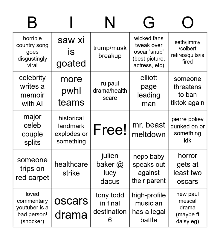 This bingo card has a free space and 24 words: healthcare strike, oscars drama, ru paul drama/health scare, loved commentary youtuber is a bad person! (shocker), seth/jimmy /colbert retires/quits/is fired, horrible country song goes disgustingly viral, celebrity writes a memoir with AI, saw xi is goated, mr. beast meltdown, julien baker @ lucy dacus, elliott page leading man, major celeb couple splits, nepo baby speaks out against their parent, horror gets at least two oscars, more pwhl teams, high-profile musician has a legal battle, pierre poliev dunked on or something idk, trump/musk breakup, someone threatens to ban tiktok again, historical landmark explodes or something, new paul mescal drama (maybe ft daisy eg), someone trips on red carpet, wicked fans tweak over oscar 'snub' (best picture, actress, etc) and tony todd in final destination 6.