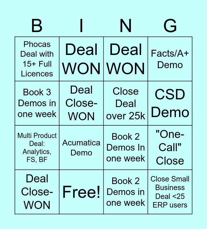This bingo card has 16 words: Free!, "One-Call" Close, Deal WON, Phocas Deal with 15+ Full Licences, Multi Product Deal: Analytics, FS, BF, Deal WON, Book 2 Demos In one week, Book 2 Demos in one week, Book 3 Demos in one week, Deal Close-WON, Deal Close-WON, Facts/A+ Demo, Acumatica Demo, CSD Demo, Close Deal over 25k and Close Small Business Deal <25 ERP users.