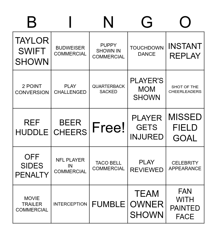 This bingo card has a free space and 28 words: CELEBRITY APPEARANCE, COCA-COLA COMMERCIAL, PLAYER'S MOM SHOWN, TEAM OWNER SHOWN, 2 POINT CONVERSION, PUPPY SHOWN IN COMMERCIAL, BUDWEISER COMMERCIAL, OFF SIDES PENALTY, PLAYER GETS INJURED, MOVIE TRAILER COMMERCIAL, REF HUDDLE, TOUCHDOWN DANCE, INTERCEPTION, FUMBLE, SHOT OF THE CHEERLEADERS, DORITOS COMMERCIAL, NFL PLAYER IN COMMERCIAL, PLAY CHALLENGED, QUARTERBACK SACKED, TACO BELL COMMERCIAL, TAYLOR SWIFT SHOWN, QUARTERBACK TOUCHDOWN, FAN WITH PAINTED FACE, BEER CHEERS, MISSED FIELD GOAL, PLAY REVIEWED, INSTANT REPLAY and WEATHER UPDATE.