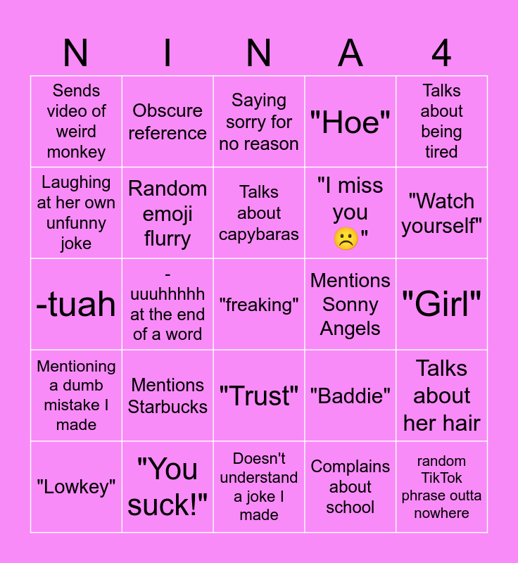 This bingo card has a free space and 24 words: Mentions Starbucks, "You suck!", Talks about capybaras, "Lowkey", Talks about being tired, Sends video of weird monkey, Laughing at her own unfunny joke, Obscure reference, Mentions Sonny Angels, "Trust", "I miss you ☹️", -tuah, "Baddie", Talks about her hair, Random emoji flurry, Complains about school, "Girl", Saying sorry for no reason, "Watch yourself", -uuuhhhhh at the end of a word, random TikTok phrase outta nowhere, Mentioning a dumb mistake I made, "Hoe" and Doesn't understand a joke I made.