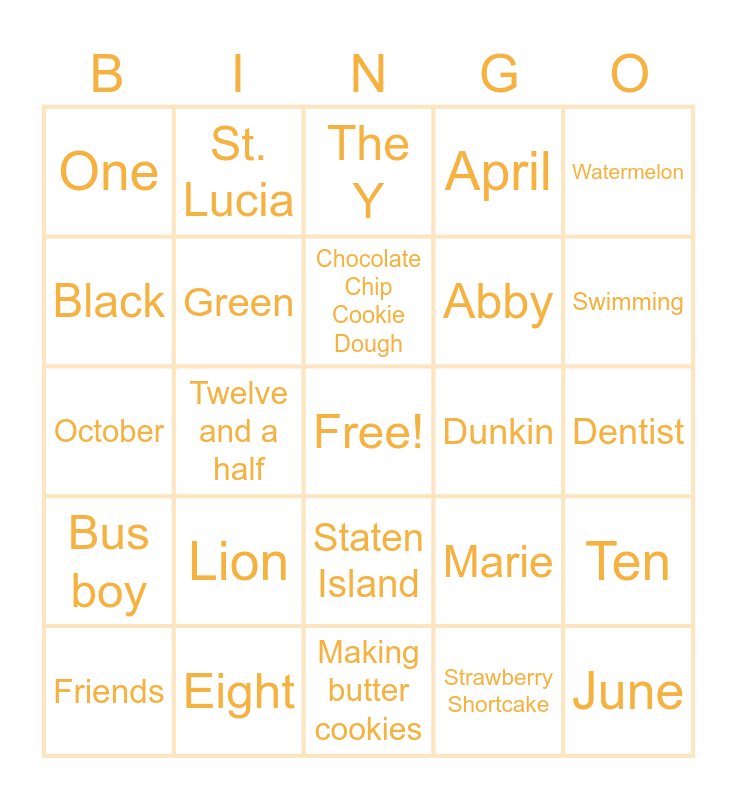 This bingo card has a free space and 27 words: Marie, Hunter, Abby, Making butter cookies, Black, The Y, St. Lucia, Bus boy, Dunkin, Ten, October, April, Friends, Eight, Swimming, Bunny, Green, Chocolate Chip Cookie Dough, Lion, One, Dentist, Strawberry Shortcake, Twelve and a half, June, Staten Island, Watermelon and Reese's.