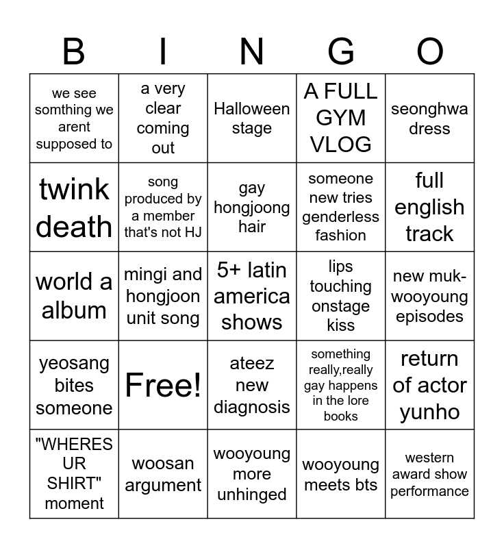 This bingo card has 25 words: Free!, wooyoung more unhinged, gay hongjoong hair, "WHERES UR SHIRT" moment, seonghwa dress, we see somthing we arent supposed to, twink death, a very clear coming out, lips touching onstage kiss, ateez new diagnosis, someone new tries genderless fashion, world a album, something really,really gay happens in the lore books, return of actor yunho, song produced by a member that's not HJ, western award show performance, new muk-wooyoung episodes, Halloween stage, full english track, mingi and hongjoon unit song, 5+ latin america shows, woosan argument, yeosang bites someone, A FULL GYM VLOG and wooyoung meets bts.