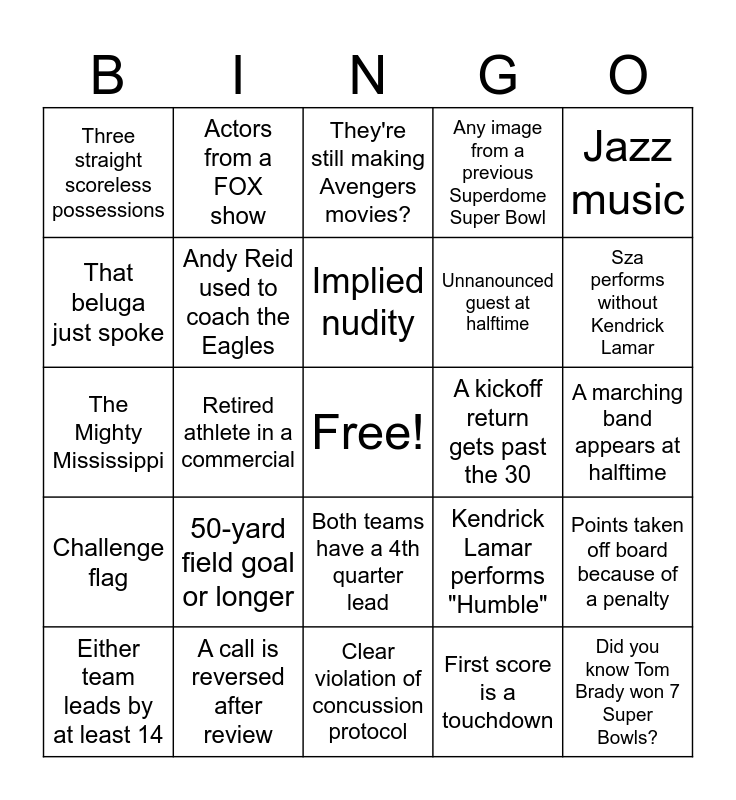 This bingo card has a free space and 75 words: We meet Other David, His name isn't Chasmo?, They're still making Avengers movies?, Clydesdales!, Shania Twain requests cold foam, Puppies!, Gambling isn't bad. Honest!, Willem Dafoe plays pickleball, An ad asking you to scan a QR code, Why is Matthew McConaughey being Mike Ditka?, Commercial where it's unclear what the product is, Why is Antonio Bandaras with a fake Randy Savage?, Implied nudity, That beluga just spoke, Player or coach in the game appears in a commerical, Retired athlete in a commercial, Jon Batiste's national anthem exceeds 2:00, Did you know Tom Brady won 7 Super Bowls?, Bourbon Street, Jazz music, Jason Kelce holding a beer, The Mighty Mississippi, Andy Reid used to coach the Eagles, Actors from a FOX show, Any image from a previous Superdome Super Bowl, Hey, it's Caitlin Clark!, We get it, Taylor Swift is here, Any image from the previous KC-Phi Super Bowl, Obvious swear word, Hurricane Katrina, Split screen of both coaches, Remember the blackout?, Kendrick Lamar performs "Not Like Us", Kendrick Lamar performs "Humble", Sza performs without Kendrick Lamar, Unnanounced guest at halftime, Eight total songs at halftime (or more), Halftime performer wears a jersey, A marching band appears at halftime, First score is a touchdown, First score is not a touchdown, Chiefs score first, Eagles score first, Tie game (after 0-0), Safety, Scoreless quarter, Either team leads by at least 14, Three straight scoreless possessions, Touchdown of 35 yards or longer, Touchdown of 2 yards or shorter, Points scored in final two minutes of either half, Both teams have a 4th quarter lead, A player celebrates a touchdown early, Rushing touchdown by a non-running back, Return touchdown (fumble, interception, punt, kick), Turnover, 2-point conversion, Same player scores two touchdowns, Three different players throw a pass, A team scores three straight times, 50-yard field goal or longer, Missed kick, Blocked kick, Fake punt, A team punts three stright times, A kickoff return gets past the 30, Attempted onside kick, Failed tush push, Yelling match between coach and player, Points taken off board because of a penalty, Challenge flag, A call is reversed after review, Personal foul penalty, Clear violation of concussion protocol and 50 total points scored (or more).