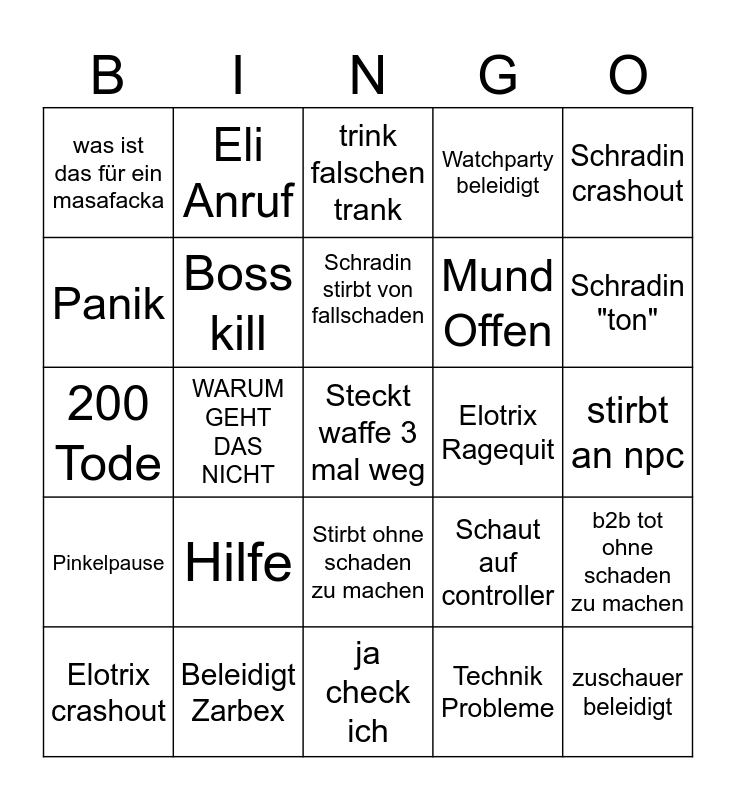 This bingo card has a free space and 34 words: Elotrix schreit Schradin an, Technik Probleme, 10 subs, 100 euro dono, Pinkelpause, Boss kill, Schradin crashout, Elotrix crashout, Eli Anruf, Wo bin ich, Schradin stirbt von fallschaden, trink falschen trank, Beleidigt gegner, Schlägt gegen Tisch, Elotrix Ragequit, Schradin "ton", Beleidigt Zarbex, 200 Tode, Hilfe, Schaut auf controller, Stirbt ohne schaden zu machen, Das Wetter ist schlecht, was ist das für ein masafacka, stirbt an npc, ja check ich, zuschauer beleidigt, Watchparty beleidigt, Zunge, Mund Offen, Panik, aufstehen, WARUM GEHT DAS NICHT, b2b tot ohne schaden zu machen and Erschrecken.