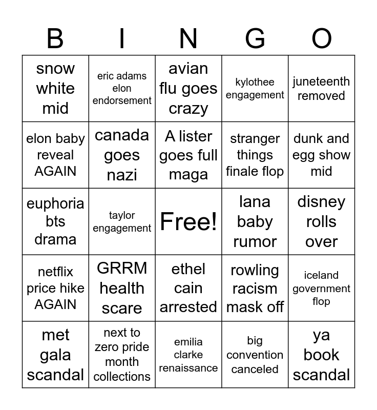 This bingo card has a free space and 24 words: GRRM health scare, next to zero pride month collections, A lister goes full maga, met gala scandal, juneteenth removed, snow white mid, elon baby reveal AGAIN, eric adams elon endorsement, lana baby rumor, ethel cain arrested, stranger things finale flop, euphoria bts drama, rowling racism mask off, iceland government flop, canada goes nazi, big convention canceled, disney rolls over, avian flu goes crazy, dunk and egg show mid, taylor engagement, ya book scandal, netflix price hike AGAIN, kylothee engagement and emilia clarke renaissance.