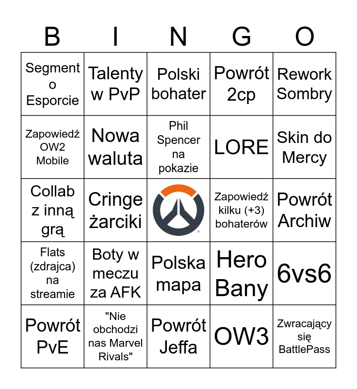 This bingo card has a free space and 24 words: Boty w meczu za AFK, "Nie obchodzi nas Marvel Rivals", Phil Spencer na pokazie, Powrót PvE, Rework Sombry, Segment o Esporcie, Zapowiedź OW2 Mobile, Talenty w PvP, Zapowiedź kilku (+3) bohaterów, Polska mapa, LORE, Collab z inną grą, Hero Bany, 6vs6, Nowa waluta, OW3, Powrót Archiw, Polski bohater, Skin do Mercy, Cringe żarciki, Zwracający się BattlePass, Flats (zdrajca) na streamie, Powrót 2cp and Powrót Jeffa.