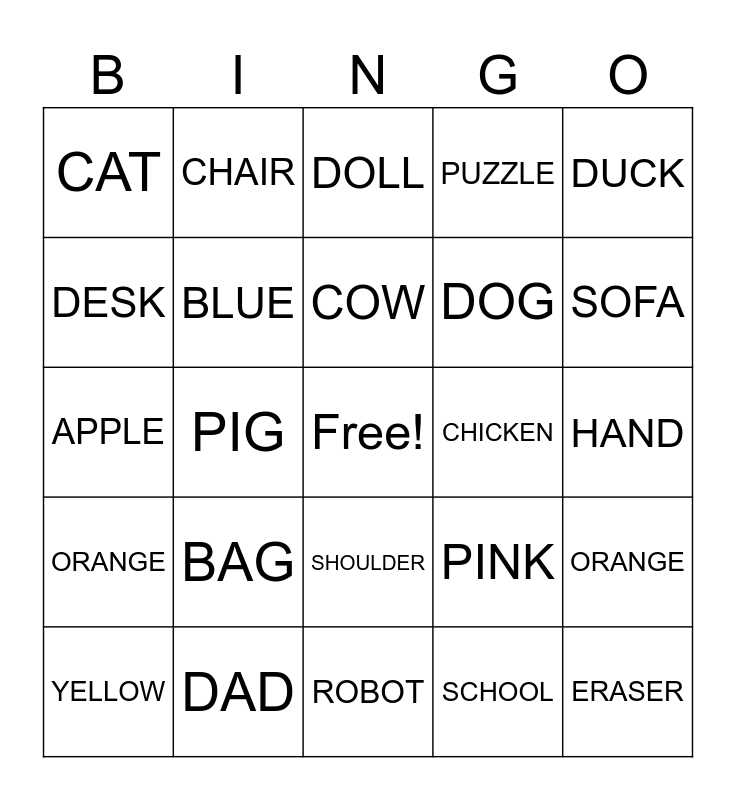 This bingo card has a free space and 53 words: BOOK, ERASER, PENCIL, SCHOOL, BAG, BOARD, CHAIR, COMPUTER, DESK, WINDOW, BLUE, GREEN, ORANGE, PINK, RED, YELLOW, COW, CHICKEN, HORSE, DUCK, PIG, SHEEP, DOG, CAT, MOM, DAD, GRANDMA, GRANDPA, BED, SOFA, TABLE, ARMCHAIR, TV, SHOWER, CAR, DINOSAUR, PUZZLE, ROBOT, DOLL, LEG, ARM, HEAD, HAND, FOOT, KNEE, SHOULDER, TOE, FINGER, APPLE, ORANGE, STRAWBERRY, MANGO and LEMON.