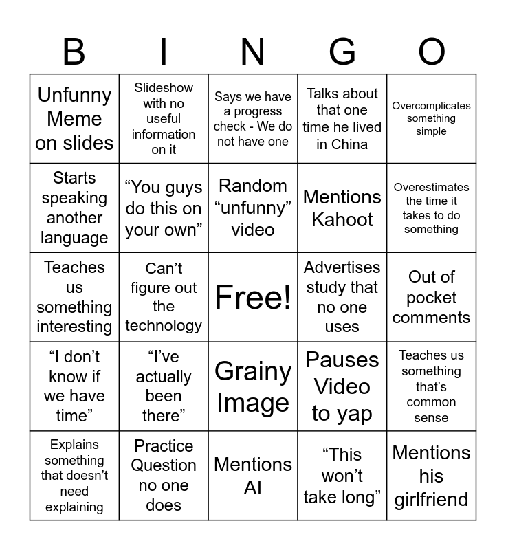 This bingo card has a free space and 37 words: Looks to us to answer question when the class is silent, *crickets*, Goes on a tangent, “You guys do this on your own”, Teaches us something that’s common sense, “I’ve actually been there”, Random “unfunny” video, Zzzzz class falling asleep, Overcomplicates something simple, Runs out of time in class, Can’t figure out the technology, Talks about that one time he lived in China, Mentions his girlfriend, Out of pocket comments, Starts speaking another language, “I don’t know if we have time”, “This will be on the exam”, Says we have a progress check - We do not have one, Grainy Image, Advertises study that no one uses, Unfunny Meme on slides, Overestimates the time it takes to do something, Explains something that doesn’t need explaining, Mentions AI, Asks if anyone has travelled to xyz so he can brag about his trips, “This won’t take long”, Slideshow with no useful information on it, Forgets to give us document acsess, Wears his 12 year old boy hoodie, Monty Python reference, Teaches us something we already know, Practice Question no one does, Teaches us something interesting, Asks who did the reading, Pauses Video to yap, Mentions Kahoot and Takes more than five minutes to set up the screen.