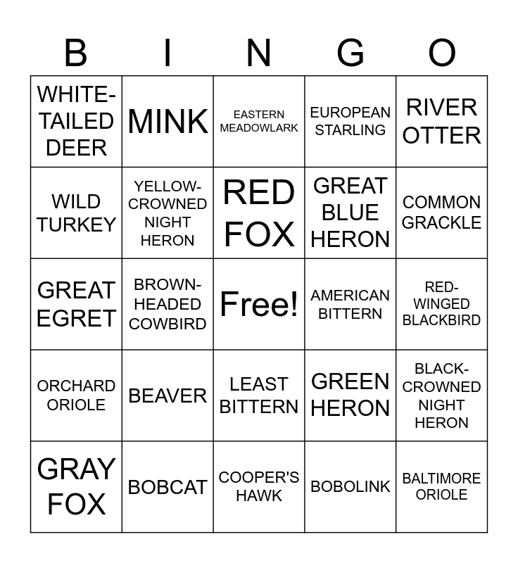This bingo card has a free space and 24 words: BEAVER, BOBCAT, RED FOX, GRAY FOX, RIVER OTTER, WHITE-TAILED DEER, WILD TURKEY, MINK, AMERICAN BITTERN, LEAST BITTERN, GREAT BLUE HERON, GREAT EGRET, GREEN HERON, BLACK-CROWNED NIGHT HERON, YELLOW-CROWNED NIGHT HERON, BOBOLINK, RED-WINGED BLACKBIRD, EASTERN MEADOWLARK, COMMON GRACKLE, BROWN-HEADED COWBIRD, BALTIMORE ORIOLE, ORCHARD ORIOLE, EUROPEAN STARLING and COOPER'S HAWK.