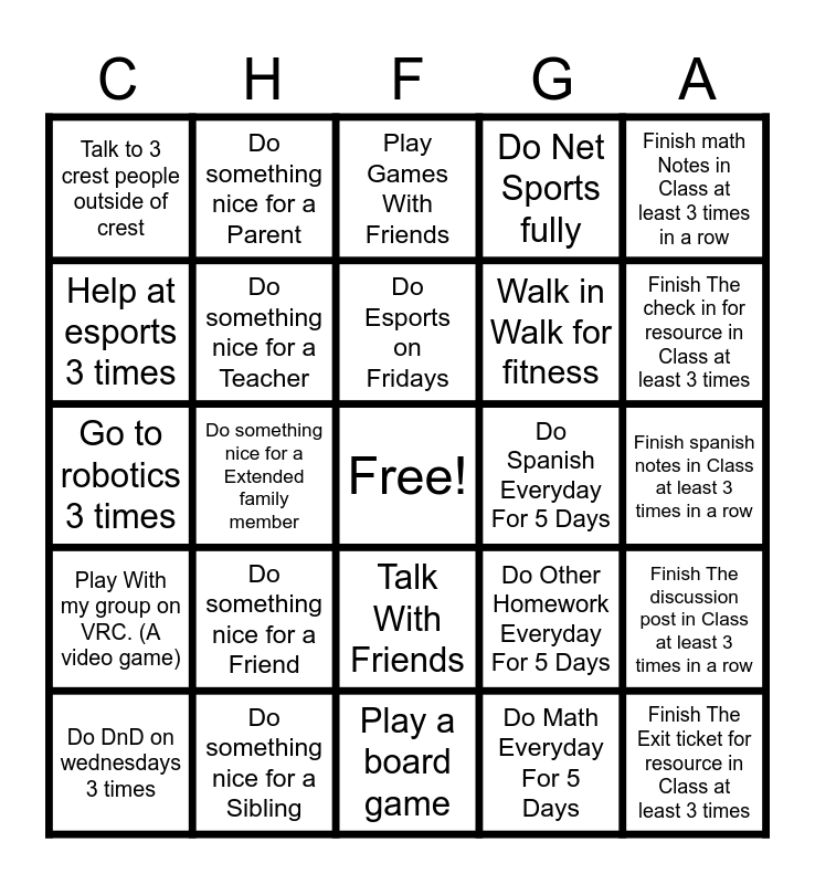 This bingo card has a free space and 24 words: Do DnD on wednesdays 3 times, Do something nice for a Friend, Do Esports on Fridays, Do Math Everyday For 5 Days, Finish math Notes in Class at least 3 times in a row, Talk to 3 crest people outside of crest, Do something nice for a Parent, Play Games With Friends, Do Spanish Everyday For 5 Days, Finish spanish notes in Class at least 3 times in a row, Go to robotics 3 times, Do something nice for a Teacher, Do Other Homework Everyday For 5 Days, Finish The discussion post in Class at least 3 times in a row, Help at esports 3 times, Do something nice for a Sibling, Play a board game, Do Net Sports fully, Finish The check in for resource in Class at least 3 times, Play With my group on VRC. (A video game), Do something nice for a Extended family member, Talk With Friends, Walk in Walk for fitness and Finish The Exit ticket for resource in Class at least 3 times.