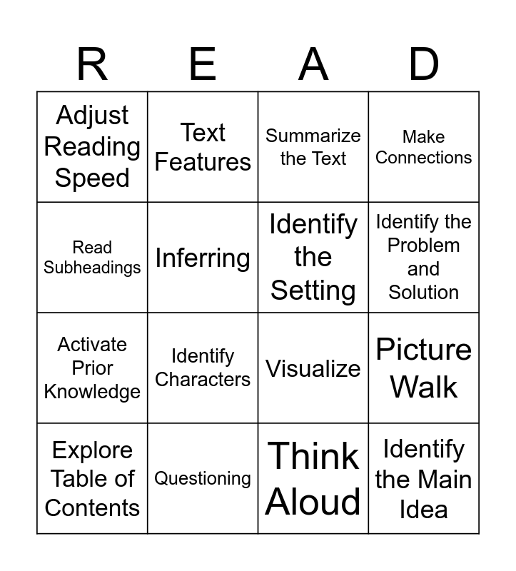 This bingo card has 24 words: Chunking Words, Read Bold Words, Identify the Problem and Solution, Locate Key Words, Read Subheadings, Adjust Reading Speed, Inferring, Text Features, Questioning, Reread, Activate Prior Knowledge, Visualize, Read the Captions, Set a purpose for reading, Identify the Setting, Use context Clues, Think Aloud, Summarize the Text, Identify Characters, Picture Walk, Explore Table of Contents, Identify the Main Idea, Make Connections and Make Predictions.