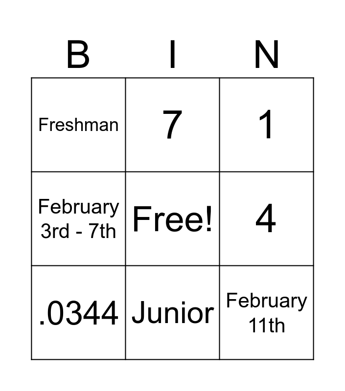 This bingo card has a free space and 8 words: 4, 1, 7, .0344, Freshman, February 11th, February 3rd - 7th and Junior.