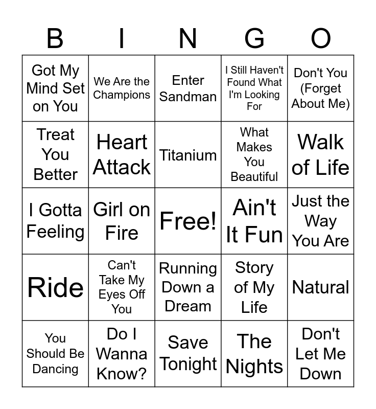 This bingo card has a free space and 45 words: Rocket Man, Don't Let Me Down, Summertime Sadness, You Should Be Dancing, Adventure of a Lifetime, The Nights, Enter Sandman, Should I Stay or Should I Go, Don't You (Forget About Me), Do I Wanna Know?, I Still Haven't Found What I'm Looking For, Ain't It Fun, Running Down a Dream, Can't Take My Eyes Off You, Chelsea Dagger, Save Tonight, Accidentally in Love, I Gotta Feeling, Just Can't Get Enough, Walk of Life, We Are the Champions, Rock’n Me, Abracadabra, Got My Mind Set on You, California, Just the Way You Are, High Hopes, Love Story, Story of My Life, Ride, Stressed Out, Natural, Youngblood, Something Just Like This, Lost, Girl on Fire, Part of Me, Maps, Scars to Your Beautiful, Titanium, Treat You Better, What Makes You Beautiful, Mercy, Heart Attack and Rockabye.