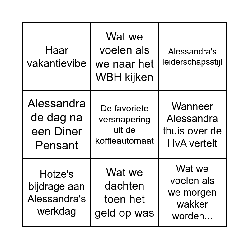 This bingo card has 9 words: Hotze's bijdrage aan Alessandra's werkdag, Alessandra's leiderschapsstijl, Wat we voelen als we naar het WBH kijken, Alessandra de dag na een Diner Pensant, Haar vakantievibe, Wanneer Alessandra thuis over de HvA vertelt, De favoriete versnapering uit de koffieautomaat, Wat we voelen als we morgen wakker worden... and Wat we dachten toen het geld op was.