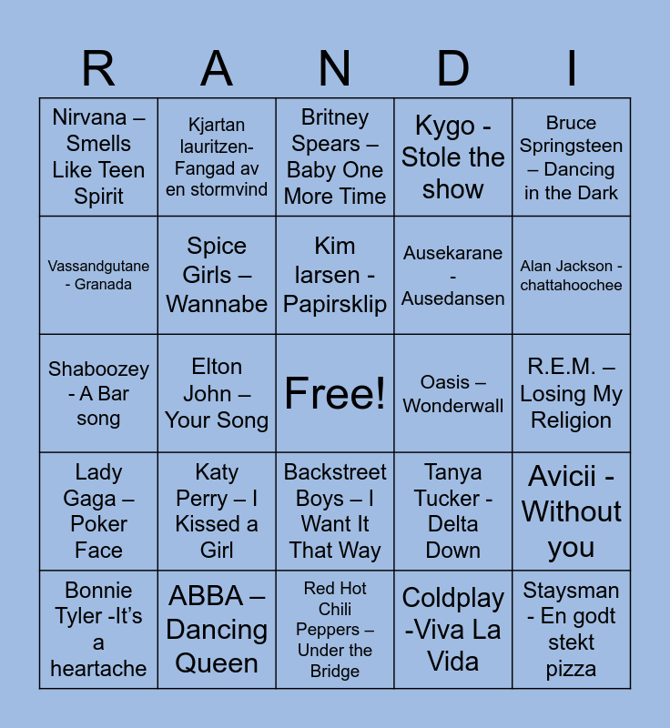 This bingo card has a free space and 30 words: ABBA β Dancing Queen, Queen β Bohemian Rhapsody, Elton John β Your Song, The Bee Gees β Stayin' Alive, Nirvana β Smells Like Teen Spirit, Britney Spears β Baby One More Time, Spice Girls β Wannabe, Backstreet Boys β I Want It That Way, Oasis β Wonderwall, Red Hot Chili Peppers β Under the Bridge, R.E.M. β Losing My Religion, Staysman - En godt stekt pizza, Coldplay -Viva La Vida, Benson Boone - Beautiful thing, Alan Jackson - chattahoochee, Rihanna β Umbrella, Tanya Tucker - Delta Down, Lady Gaga β Poker Face, Katy Perry β I Kissed a Girl, Bruce Springsteen β Dancing in the Dark, Shaboozey - A Bar song, Brad Paisley - Mud on the Tires, Kjartan lauritzen- Fangad av en stormvind, Ausekarane - Ausedansen, Vassandgutane - Granada, Kygo - Stole the show, Avicii - Without you, Bonnie Tyler -Itβs a heartache, Kim larsen - Papirsklip and Randi Hansen - hvis jeg fikk vΓ¦re sola di.