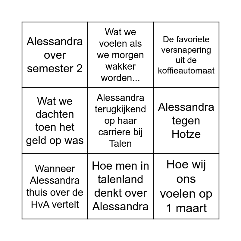 This bingo card has 9 words: Wanneer Alessandra thuis over de HvA vertelt, De favoriete versnapering uit de koffieautomaat, Wat we voelen als we morgen wakker worden..., Wat we dachten toen het geld op was, Alessandra over semester 2, Alessandra tegen Hotze, Alessandra terugkijkend op haar carriere bij Talen, Hoe wij ons voelen op 1 maart and Hoe men in talenland denkt over Alessandra.