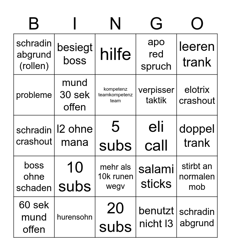This bingo card has a free space and 24 words: 10 subs, hurensohn, kompetenz teamkompetenz team, 60 sek mund offen, leeren trank, schradin abgrund (rollen), probleme, besiegt boss, eli call, mehr als 10k runen wegv, verpisser taktik, schradin crashout, salami sticks, stirbt an normalen mob, mund 30 sek offen, benutzt nicht l3, doppel trank, hilfe, elotrix crashout, l2 ohne mana, schradin abgrund, boss ohne schaden, apo red spruch and 20 subs.