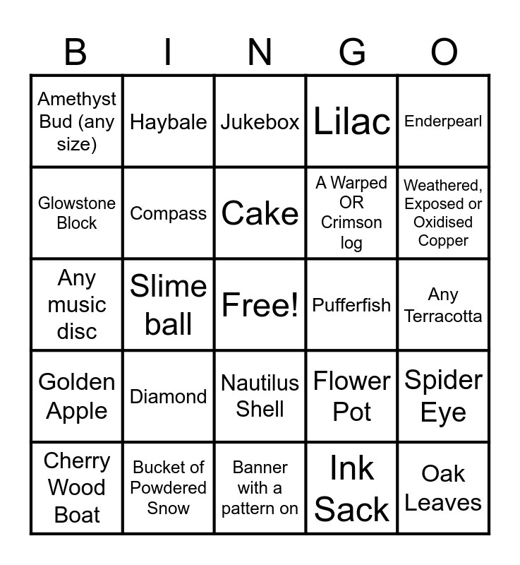 This bingo card has a free space and 24 words: Diamond, Bucket of Powdered Snow, Cake, Cherry Wood Boat, Enderpearl, Amethyst Bud (any size), Glowstone Block, Haybale, Pufferfish, Nautilus Shell, A Warped OR Crimson log, Any music disc, Flower Pot, Spider Eye, Compass, Ink Sack, Any Terracotta, Jukebox, Weathered, Exposed or Oxidised Copper, Slime ball, Oak Leaves, Golden Apple, Lilac and Banner with a pattern on.