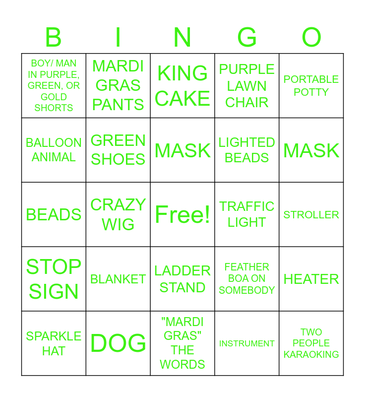 This bingo card has a free space and 39 words: PURPLE LAWN CHAIR, LSU TENT, FLEUR-DI-LIS, GREEN SHOES, SPARKLE HAT, LADDER STAND, MASK, SLIDE, PORTABLE POTTY, STOP SIGN, CRAZY WIG, PURPLE LAWN CHAIR, TWO PEOPLE KARAOKING, STROLLER, TRAFFIC LIGHT, BLANKET, SWING, BOY/ MAN IN PURPLE, GREEN, OR GOLD SHORTS, PARAMEDIC/ POLICE MULE-SIDE BY SIDE, FEATHER BOA ON SOMEBODY, BALLOON ANIMAL, "MARDI GRAS" THE WORDS, LIGHTED BEADS, MASK, CHANDELIER, IPHONE, TATTOO, WAGON, JESTER HAT, MARDI GRAS PANTS, BBQ PIT/ FIRE PIT, DOUBLOONS, KING CAKE, DOG, INSTRUMENT, FIREMAN, HEATER, BEADS and UMBRELLA.