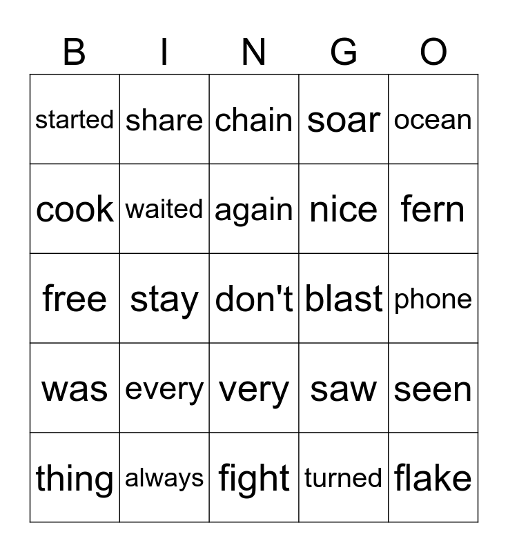 This bingo card has a free space and 24 words: every, always, again, thing, ocean, started, cook, share, blast, very, nice, free, saw, seen, waited, turned, phone, chain, fern, stay, flake, was, soar and fight.