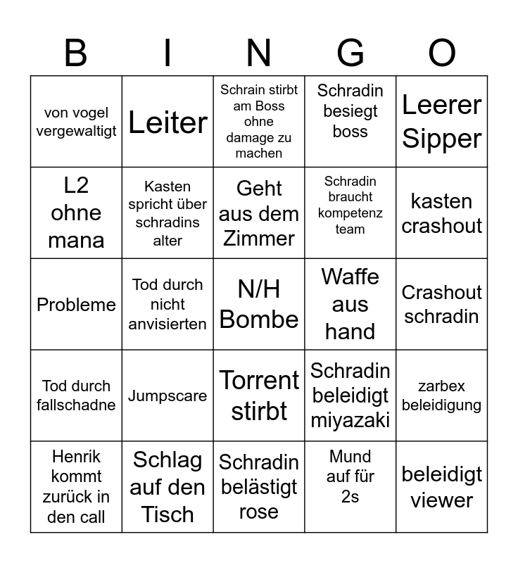 This bingo card has a free space and 24 words: Jumpscare, Schlag auf den Tisch, Geht aus dem Zimmer, Henrik kommt zurück in den call, Leerer Sipper, von vogel vergewaltigt, L2 ohne mana, Leiter, Waffe aus hand, Torrent stirbt, Schradin braucht kompetenz team, Probleme, Schradin beleidigt miyazaki, zarbex beleidigung, Kasten spricht über schradins alter, Mund auf für 2s, Crashout schradin, Schrain stirbt am Boss ohne damage zu machen, kasten crashout, Tod durch nicht anvisierten, beleidigt viewer, Tod durch fallschadne, Schradin besiegt boss and Schradin belästigt rose.