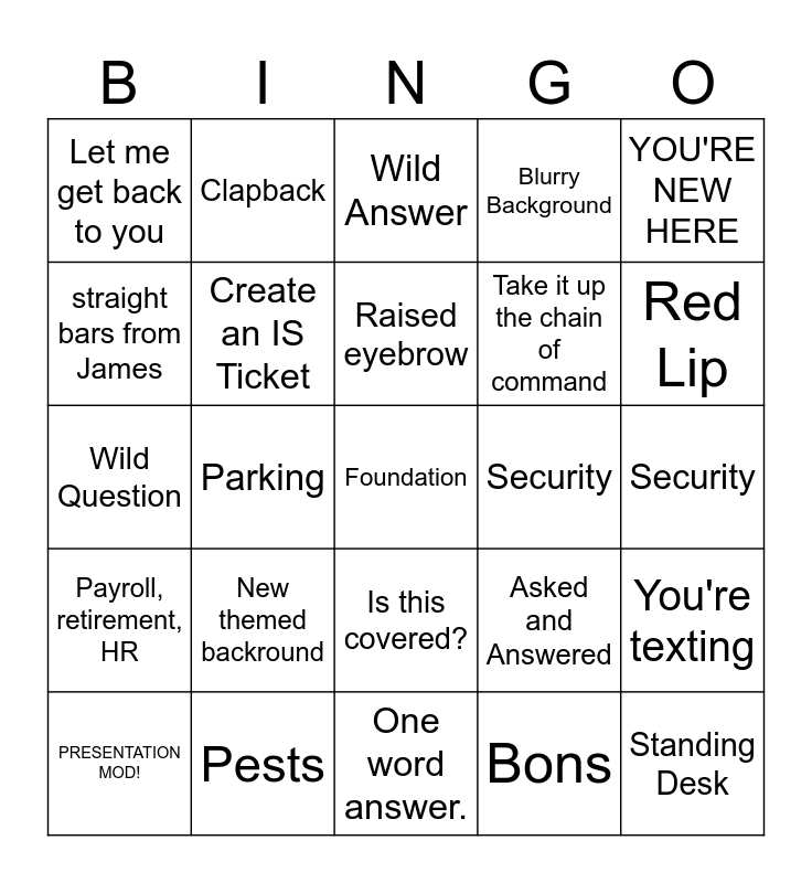This bingo card has a free space and 24 words: New themed backround, Pests, Raised eyebrow, PRESENTATION MOD!, YOU'RE NEW HERE, Let me get back to you, straight bars from James, Clapback, Security, Is this covered?, Take it up the chain of command, Wild Question, Asked and Answered, You're texting, Create an IS Ticket, Bons, Security, Wild Answer, Red Lip, Parking, Standing Desk, Payroll, retirement, HR, Blurry Background and One word answer..