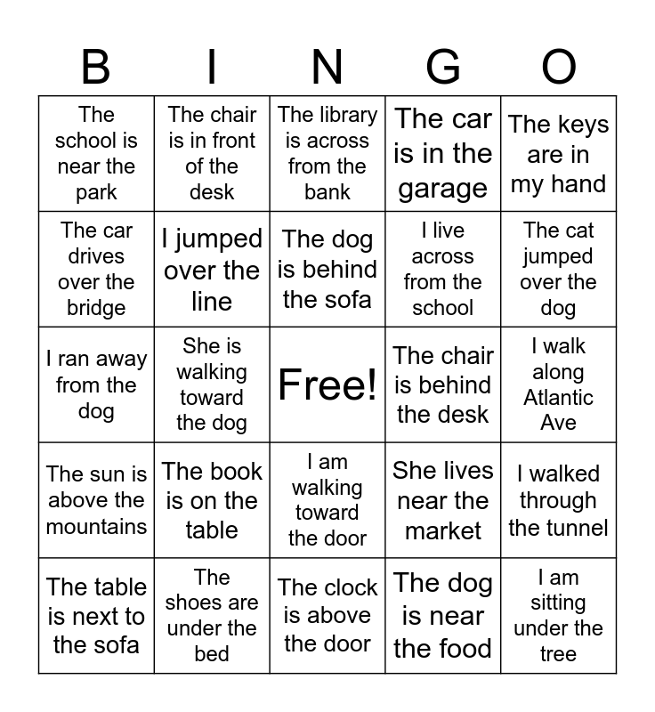 This bingo card has a free space and 24 words: The book is on the table, The shoes are under the bed, The dog is behind the sofa, The table is next to the sofa, The keys are in my hand, The school is near the park, The car drives over the bridge, The chair is in front of the desk, The chair is behind the desk, I am walking toward the door, I live across from the school, I ran away from the dog, She lives near the market, I walked through the tunnel, I jumped over the line, The dog is near the food, I walk along Atlantic Ave, The library is across from the bank, The cat jumped over the dog, She is walking toward the dog, I am sitting under the tree, The sun is above the mountains, The car is in the garage and The clock is above the door.