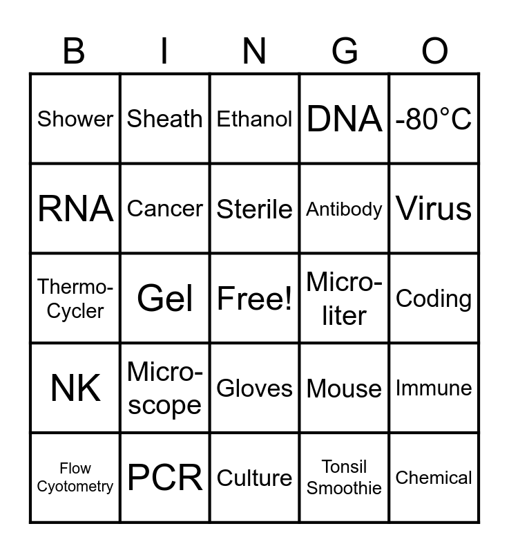 This bingo card has a free space and 34 words: Laser, Tonsil Smoothie, Acid, Pipette, NK, Cancer, -80°C, Flow Cyotometry, Sheath, Fume Hood, Sterile, Ethanol, Uterus, Centrifuge, Micro-liter, Virus, PCR, Thermo-Cycler, Micro-scope, Mouse, Gloves, Blood, Shower, Coding, Culture, Chemical, DNA, Protein, Antibody, RNA, Statistics, Gel, Immune and Media.