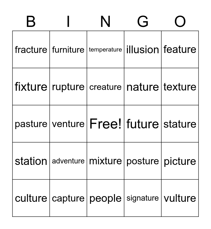 This bingo card has a free space and 24 words: adventure, capture, creature, culture, feature, fracture, fixture, furniture, future, mixture, nature, pasture, posture, picture, rupture, signature, stature, temperature, texture, venture, vulture, station, illusion and people.