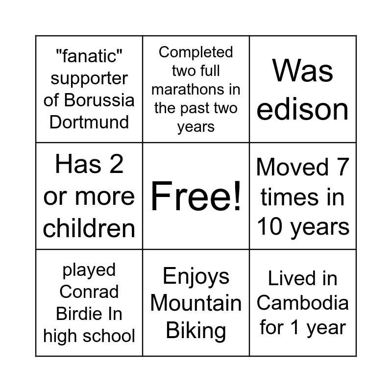 This bingo card has a free space and 12 words: Pet alligator growing up, 2 tattoos, Lived in Cambodia for 1 year, Moved 7 times in 10 years, Completed two full marathons in the past two years, Was edison, Enjoys Mountain Biking, Built a homemade snow maker, "fanatic" supporter of Borussia Dortmund, Has 2 or more children, played Conrad Birdie In high school and has completed over 250 escape rooms.