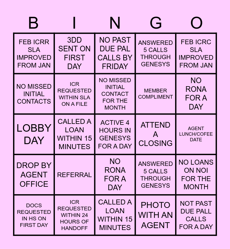 This bingo card has 25 words: REFERRAL, CALLED A LOAN WITHIN 15 MINUTES, NO MISSED INITIAL CONTACT FOR THE MONTH, DOCS REQUESTED IN HS ON FIRST DAY, FEB ICRC SLA IMPROVED FROM JAN, FEB ICRR SLA IMPROVED FROM JAN, NO MISSED INITIAL CONTACTS, 3DD SENT ON FIRST DAY, ATTEND A CLOSING, NO RONA FOR A DAY, MEMBER COMPLIMENT, LOBBY DAY, ANSWERED 5 CALLS THROUGH GENESYS, NO LOANS ON NOI FOR THE MONTH, ICR REQUESTED WITHIN SLA ON A FILE, NOT PAST DUE PALL CALLS FOR A DAY, AGENT LUNCH/COFEE DATE, NO PAST DUE PAL CALLS BY FRIDAY, NO RONA FOR A DAY, CALLED A LOAN WITHIN 15 MINUTES, ACTIVE 4 HOURS IN GENESYS FOR A DAY, ICR REQUESTED WITHIN 24 HOURS OF HANDOFF, DROP BY AGENT OFFICE, ANSWERED 5 CALLS THROUGH GENESYS and PHOTO WITH AN AGENT.