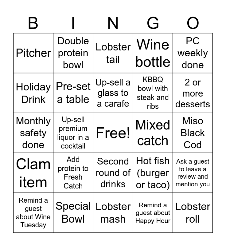 This bingo card has a free space and 24 words: Add protein to Fresh Catch, Special Bowl, Up-sell a glass to a carafe, Remind a guest about Wine Tuesday, PC weekly done, Pitcher, Holiday Drink, Double protein bowl, Mixed catch, Second round of drinks, KBBQ bowl with steak and ribs, Monthly safety done, Hot fish (burger or taco), Ask a guest to leave a review and mention you, Pre-set a table, Remind a guest about Happy Hour, Miso Black Cod, Lobster tail, 2 or more desserts, Up-sell premium liquor in a cocktail, Lobster roll, Clam item, Wine bottle and Lobster mash.