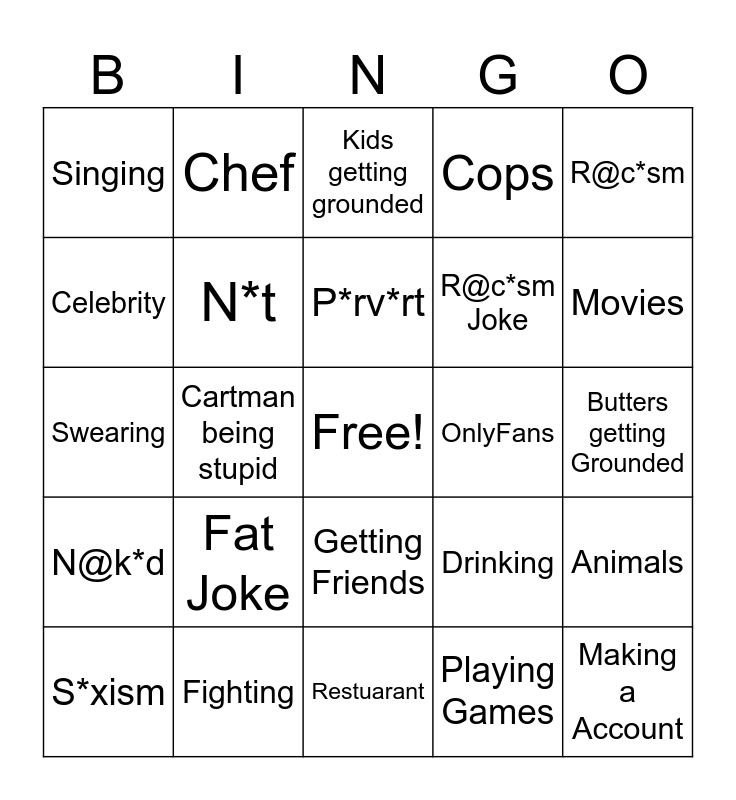 This bingo card has a free space and 24 words: Fat Joke, Fighting, P*rv*rt, S*xism, R@c*sm, Singing, Celebrity, Chef, OnlyFans, Getting Friends, R@c*sm Joke, Swearing, Drinking, Animals, N*t, Playing Games, Butters getting Grounded, Kids getting grounded, Movies, Cartman being stupid, Making a Account, N@k*d, Cops and Restuarant.