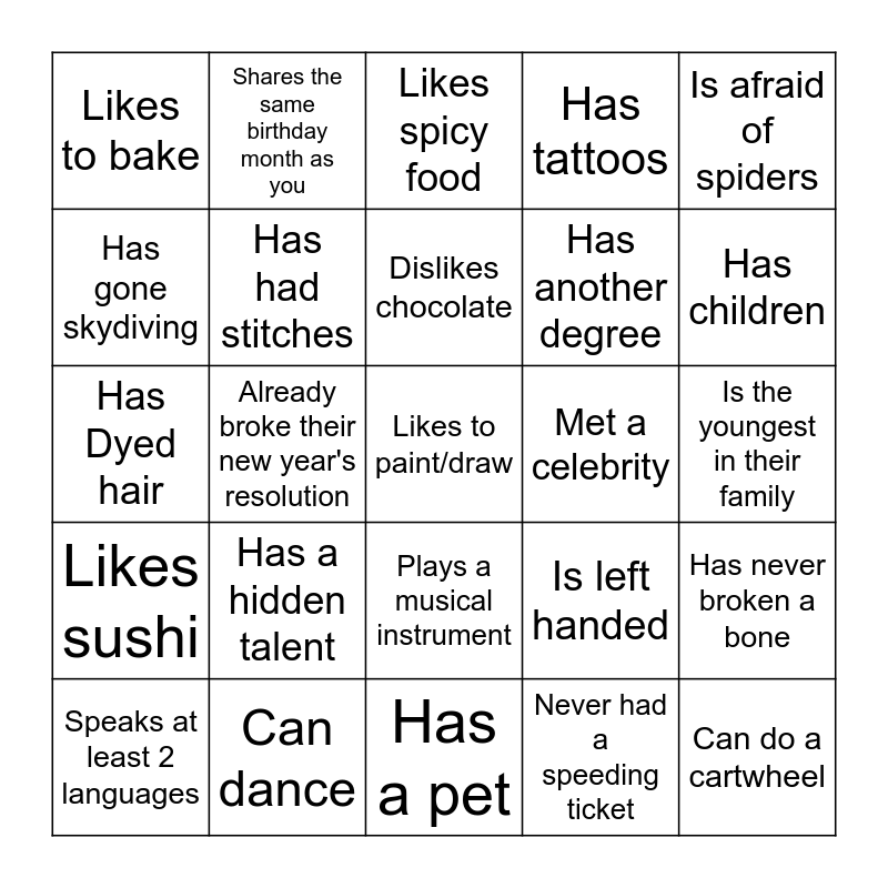 This bingo card has a free space and 24 words: Has a hidden talent, Can dance, Dislikes chocolate, Speaks at least 2 languages, Is afraid of spiders, Likes to bake, Has gone skydiving, Shares the same birthday month as you, Met a celebrity, Plays a musical instrument, Has another degree, Has Dyed hair, Is left handed, Has never broken a bone, Has had stitches, Never had a speeding ticket, Is the youngest in their family, Likes spicy food, Has children, Already broke their new year's resolution, Can do a cartwheel, Likes sushi, Has tattoos and Has a pet.
