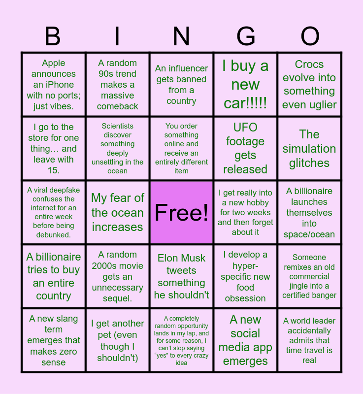 This bingo card has a free space and 24 words: A random 2000s movie gets an unnecessary sequel., I get another pet (even though I shouldn't), You order something online and receive an entirely different item, A new slang term emerges that makes zero sense, Crocs evolve into something even uglier, Apple announces an iPhone with no ports; just vibes., I go to the store for one thing… and leave with 15., A random 90s trend makes a massive comeback, I get really into a new hobby for two weeks and then forget about it, Elon Musk tweets something he shouldn't, UFO footage gets released, A viral deepfake confuses the internet for an entire week before being debunked., I develop a hyper-specific new food obsession, Someone remixes an old commercial jingle into a certified banger, Scientists discover something deeply unsettling in the ocean, A new social media app emerges, A billionaire launches themselves into space/ocean, An influencer gets banned from a country, The simulation glitches, My fear of the ocean increases, A world leader accidentally admits that time travel is real, A billionaire tries to buy an entire country, I buy a new car!!!!! and A completely random opportunity lands in my lap, and for some reason, I can’t stop saying “yes” to every crazy idea.