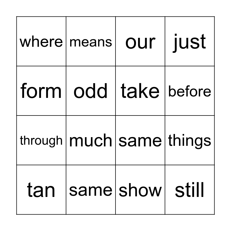 This bingo card has 16 words: same, things, our, where, through, means, same, show, form, odd, tan, just, much, before, take and still.